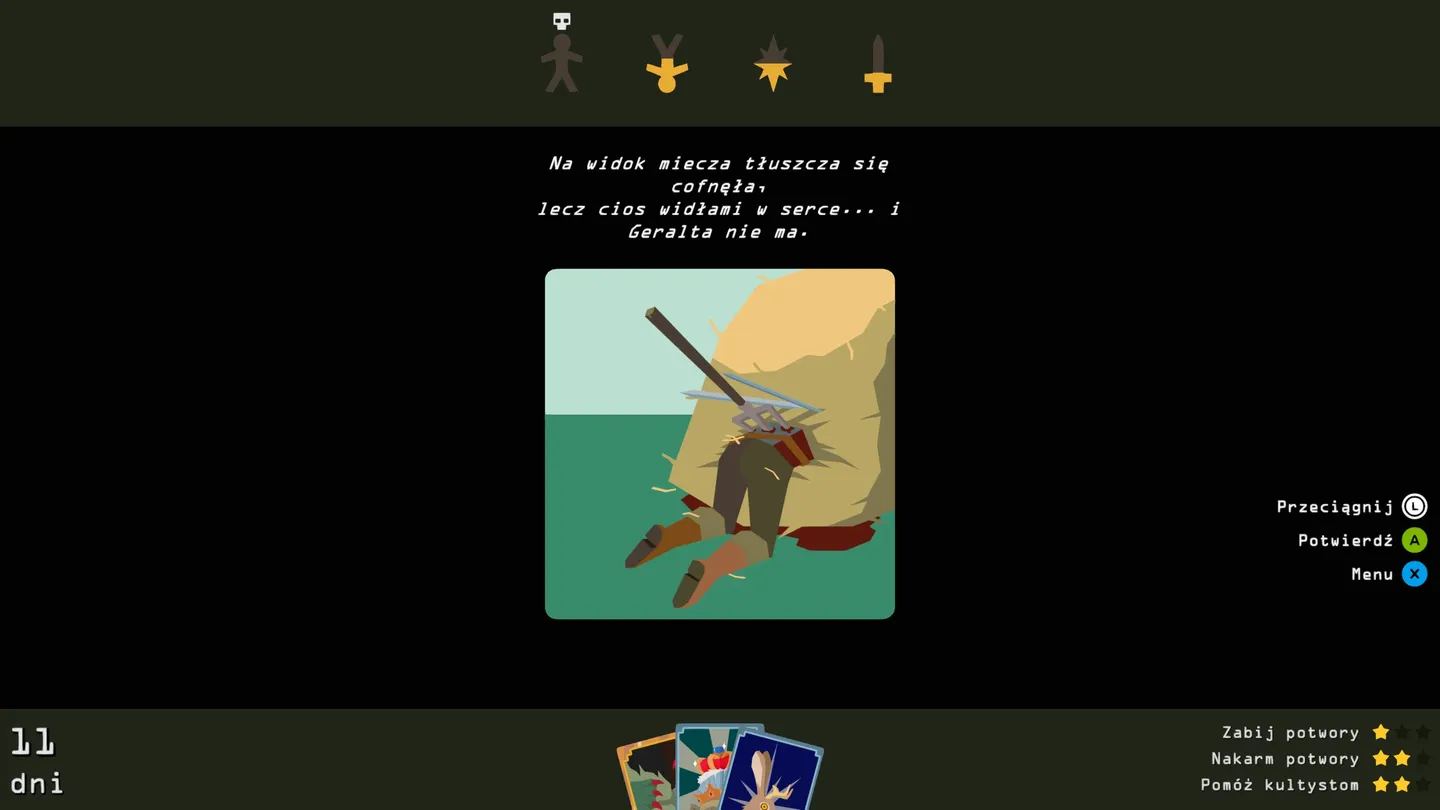 W każdej rundzie otrzymujemy trzy karty przygód, takich jak na przykład: „żyj na krawędzi”, „ciało Geralta to płótno” czy „zabij potwory”. Możemy je wymienić (łączna pula to trzy dobory) albo na ich podstawie utkać własną historię – opowiadaną przez Jaskra gdzieś w karczmie. Bo wbrew pozorom, to właśnie nasze wybory tworzą balladę śpiewaną przez tego dobrze znanego barda.
