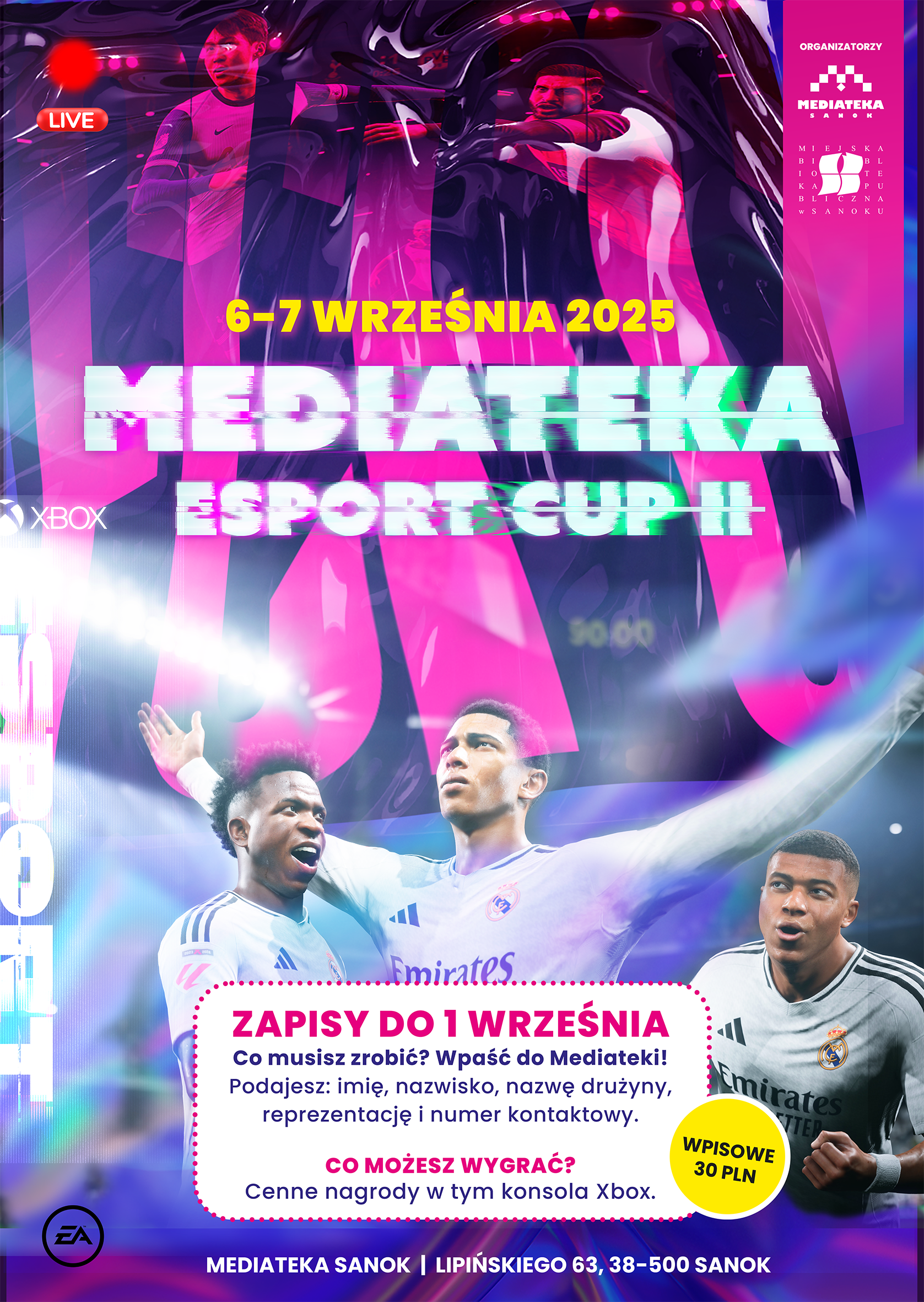 Już w dniach 6–7 września 2025 roku w Mediatece w Sanoku odbędzie się druga edycja turnieju Mediateka eSport Cup. To wyjątkowa okazja dla fanów wirtualnej piłki nożnej, by zmierzyć się w grze FC25 na konsolach Xbox.