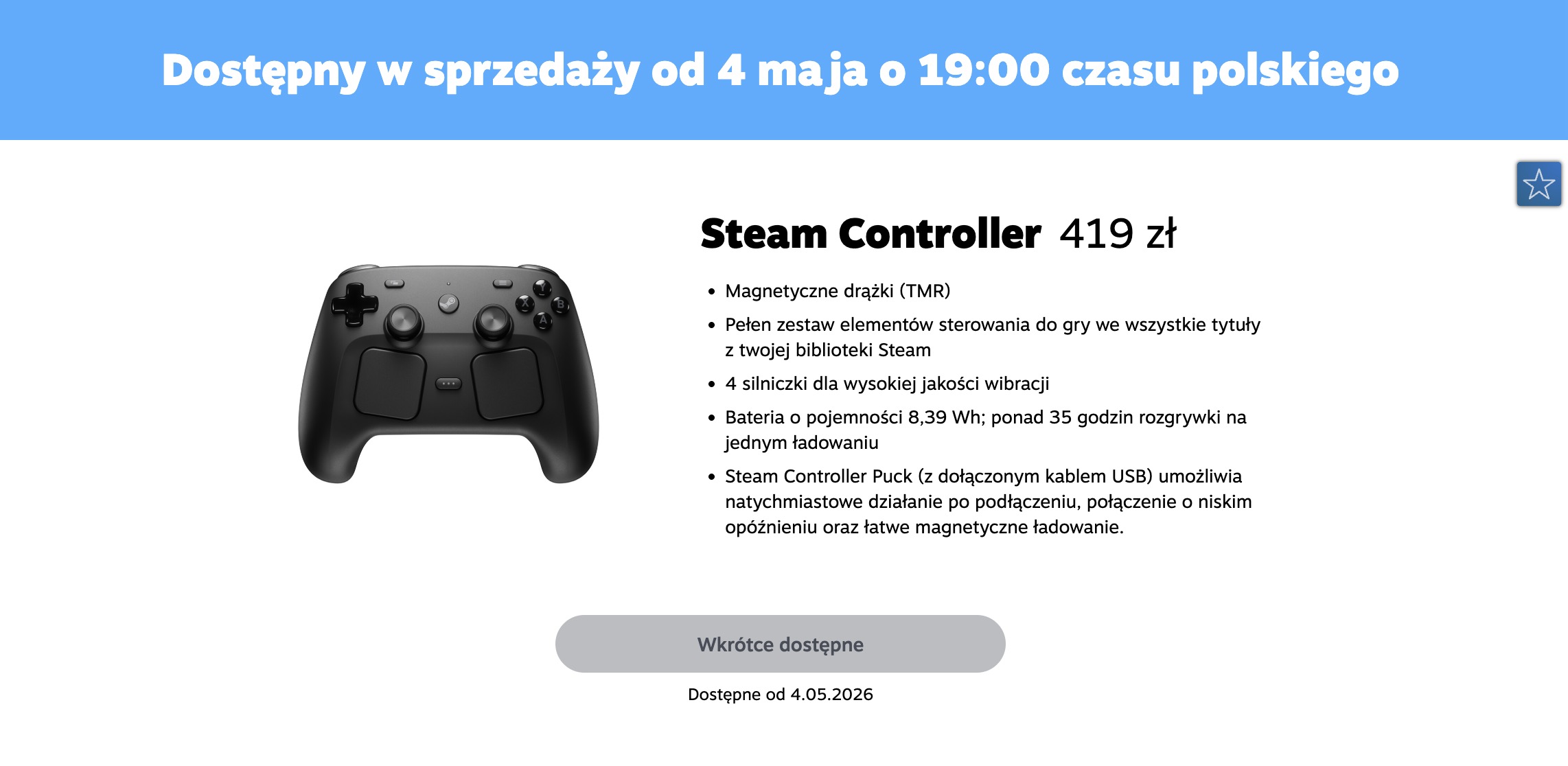 W sklepie internetowym Steama pojawiła się cena nowej generacji kontrolera do gier. Steam Controller został wyceniony na 419 zł i trafi do regularnej sprzedaży już 4 maja (następny poniedziałek) o godz. 19:00 czasu polskiego. Sprzęt będzie dostępny za pośrednictwem platformy Steam podobnie jak każda inna gra czy chociażby handheld Steam Deck.