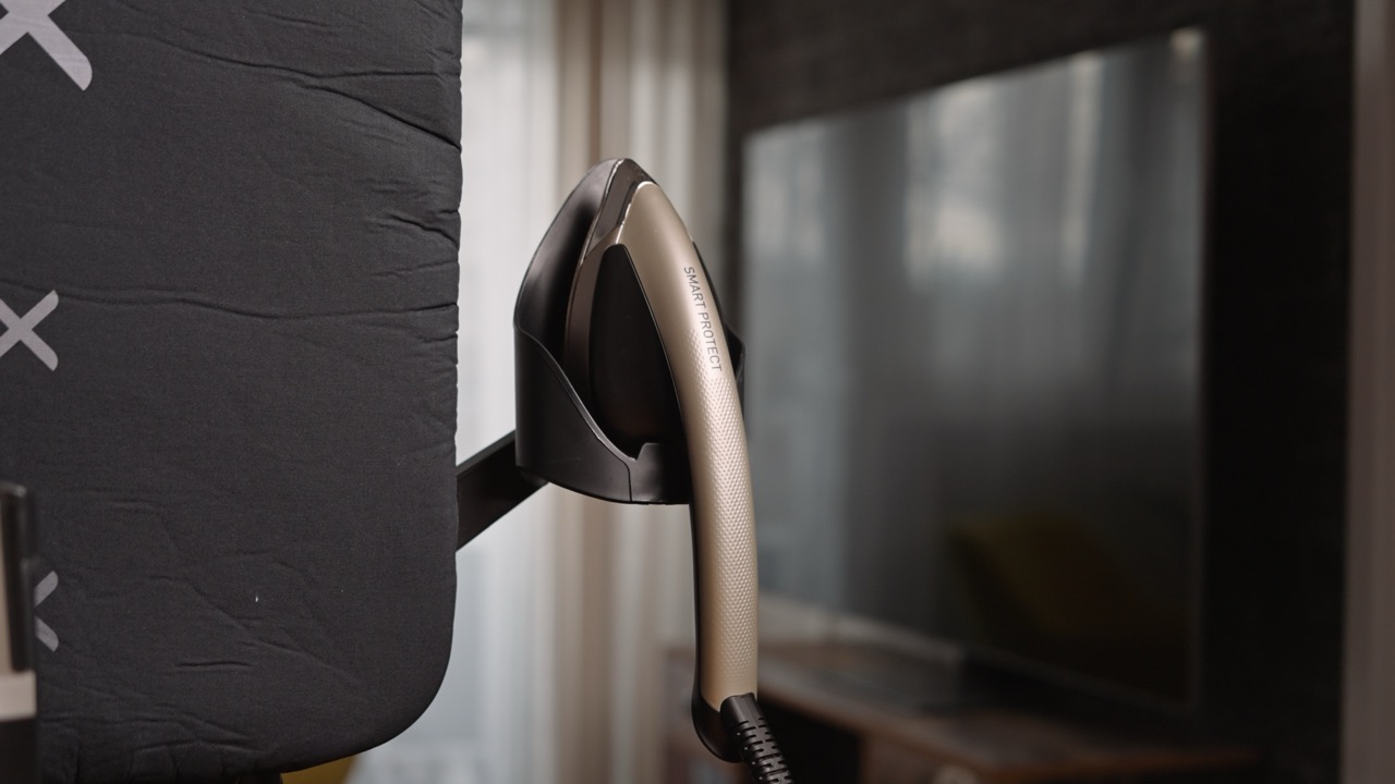 Podoba mi się również konstrukcja deski Smart Board. Po lewej lub po prawej stronie możemy zamontować uchwyt na żelazko, a na górze – uchwyt na wieszak, dzięki czemu można wygodnie powiesić do odświeżenia marynarkę. W zestawie jest też końcówka do prasowania precyzyjnego i nie zabrakło ochrony przeciwwapiennej – co jakiś czas warto opróżnić szufladkę, by nie tracić wydajności.