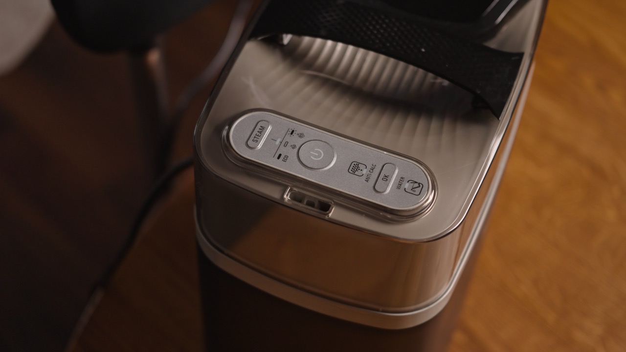 Nie zabrakło tu natomiast możliwości regulacji poziomu pary. Do tego służy guzik z napisem Steam, a urządzenie może pracować w trzech trybach: normalnym (lampka jest wyłączona), Maksymalny (lampka miga na zielono) i Minimalny (lampa świeci ciągłym zielonym światłem). I to w zasadzie tyle –