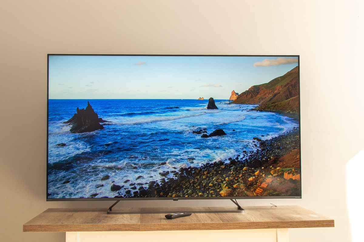 JP7000 nie udaje designerskiego rzeźbiarskiego dzieła. To klasyczny, dość masywny 65‑calowy LCD z podświetleniem direct LED/miniLED, więc głębokość obudowy jest większa niż w ultracienkich OLED‑ach. Z przodu dominuje ekran z dość wąską ramką, bez świecących logotypów i innych „atrakcji”. To plus – nic nie odciąga wzroku od obrazu.