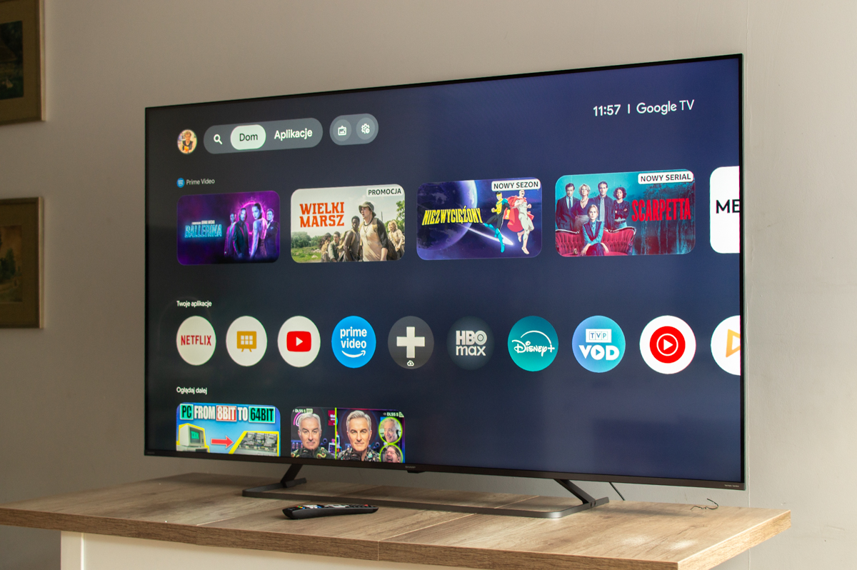Google TV w JP7000 to pełnoprawny, współczesny system, a nie „jakiś tam smart”. Dostajesz dostęp do Netflixa, Disney+, HBO Max, Prime Video, YouTube, Apple TV+, lokalnych aplikacji VOD i całej reszty ekosystemu Google Play. Interfejs jest oparty na rekomendacjach – system próbuje podpowiadać treści na podstawie tego, co oglądasz i co masz podpięte pod konto Google.