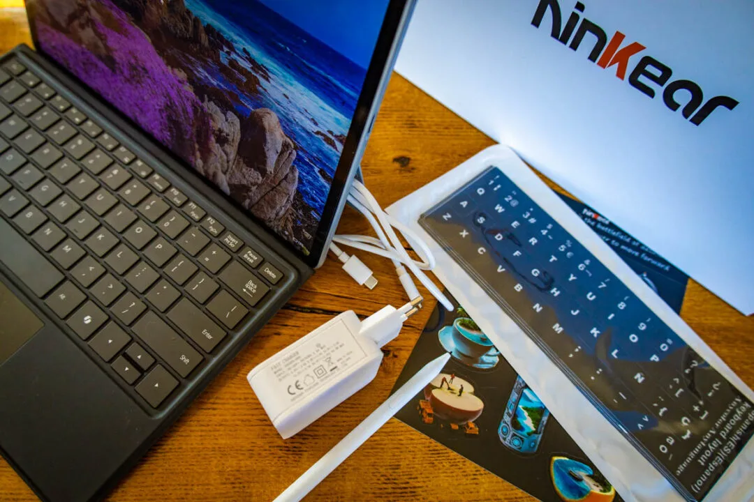 Wewnątrz pudełka czeka na nas sprzęt gotowy do pracy, co dziś wcale nie jest rynkowym standardem. Oprócz tabletu, klawiatury, rysika i nakładek językowych, Ninkear dorzuca kompletny zestaw zasilający. W czasach, gdy pod płaszczykiem ekologii producenci nagminnie ogołacają pudełka z zasilaczy, zostawiając w nich jedynie krótki kabel, tutaj dostajemy konkret. Kompaktową kostkę o mocy 65 W oraz odpowiednio długi, odczepiany przewód USB-C. To najprostsze, a zarazem najwygodniejsze rozwiązanie. Taka ładowarka bez problemu obsłuży w podróży również naszego telefona, więc pakowanie dodatkowych kabli i kostek do plecaka staje się całkowicie zbędne.