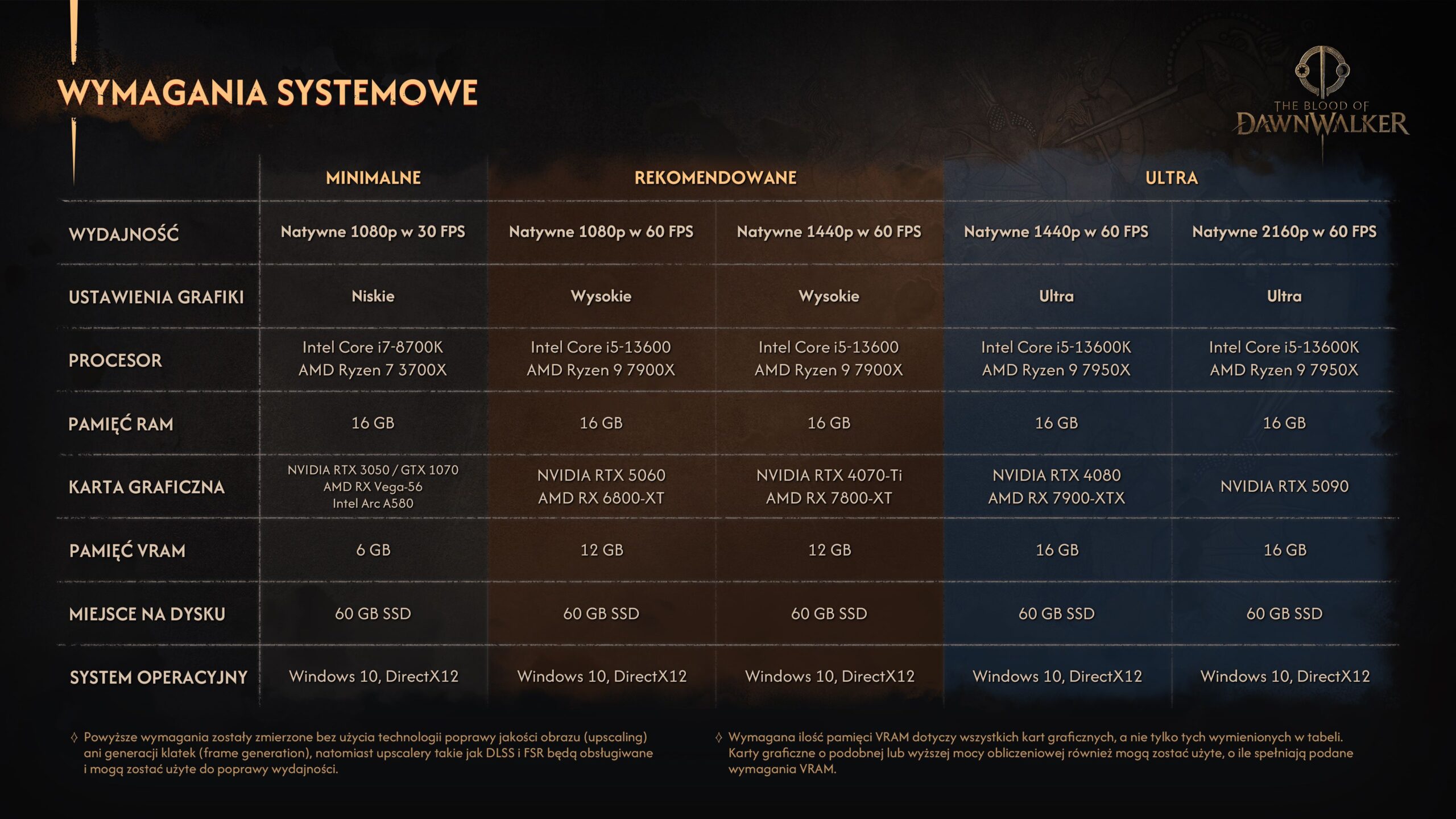 The Blood of Dawnwalker ukaże się na konsolach PlayStation 5, Xbox Series X|S oraz komputerach PC już 3 września 2026 roku. Gra będzie dostępna w pełnej polskiej wersji językowej (z dubbingiem). o ile zamierzacie grać na komputerach, to na pewno zainteresują Was wymagania tej produkcji. Możecie zapoznać się z nimi niżej. Co istotne, wymagania zostały zmierzone bez upscalingu ani generacji klatek. DLSS i FSR będą natomiast obsługiwane.