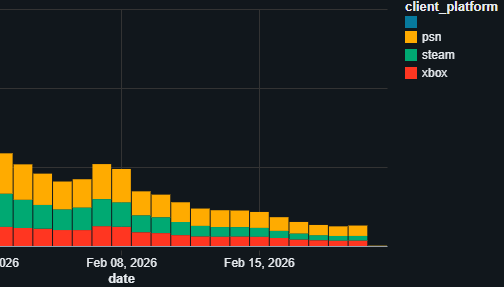 Na grafie, którego kolory ciężko zrozumieć, możemy zobaczyć, iż najwięcej ludzi w Highguard aktywnie grało na PlayStation. W ostatnich dniach liczba ta była choćby większa, niż Steam i Xbox razem wzięte.