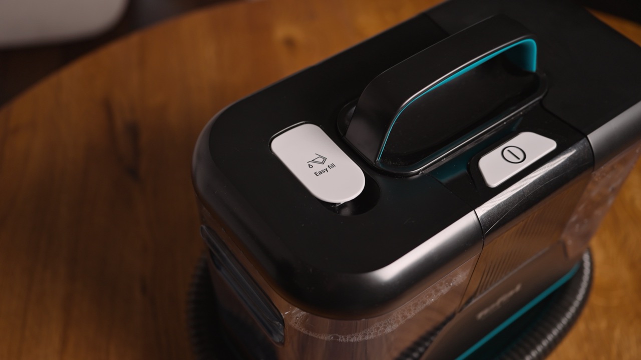 Nowy odkurzacz piorący w ofercie marki Tefal wyposażono w spory pojemnik na wodę, do której dolewamy detergent. Dzięki temu, iż ścianki są przezroczyste, od razu widać, czy Clean It jest gotowy do pracy, czy też trzeba uzupełnić płyny. Na obudowie znalazły się podziałki, które wskazują, ile trzeba dolać wody, a ile dołączonego do zestawu płynu – nie musimy używać miarki ani robić tego „na oko”.