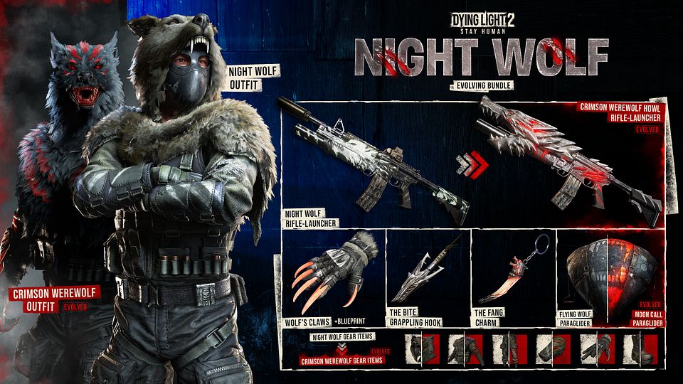Pierwszym pakietem jest Night Wolf Evolving Bundle, ewoluujący w Crimson Werewolf w miarę postępu w czteroczęściowej serii zadań. Wykonując je, gracze mogą odblokować dwie wersje karabinu, strój, sześć elementów wyposażenia oraz skórkę paralotni. Pakiet zawiera także broń białą – Wolf’s Claws oraz wyjątkową wersję haka.
