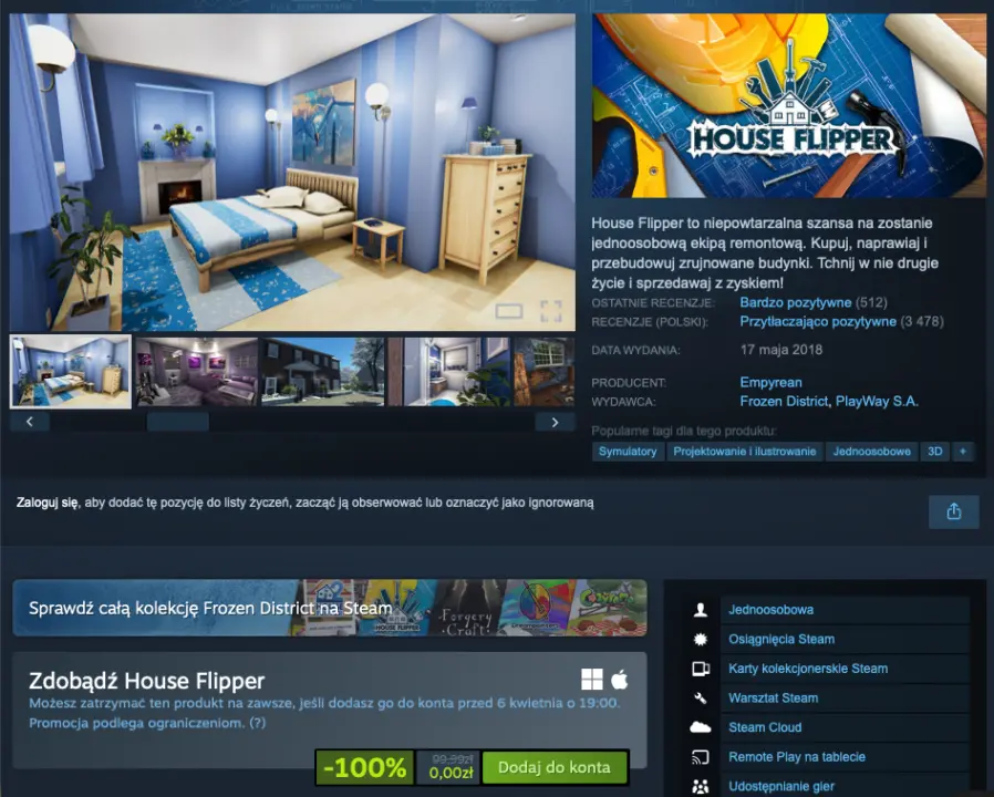 Polskie studio Frozen District postanowiło udostępnić za darmo swój największy hit w postaci House Flipper – symulatora, gdzie kierujemy jednoosobową ekipą remontową. Naszym zadaniem jest kupno domów i mieszkań, a następnie ich renowacja oraz sprzedaż. Odmalujemy ściany, ogarniemy elektrykę, zamienimy meble, odkryjemy tajemnice poprzedniego właściciela.